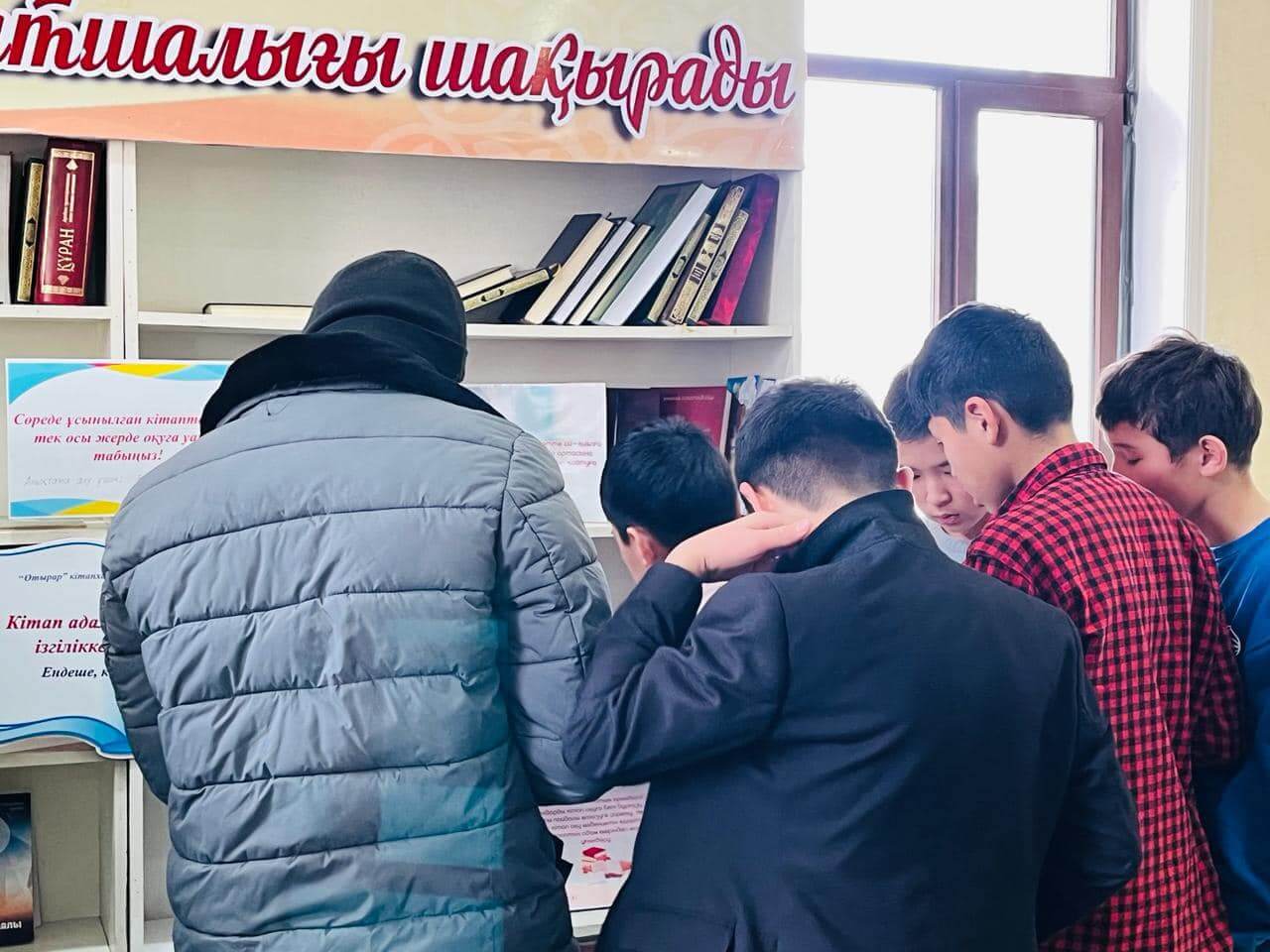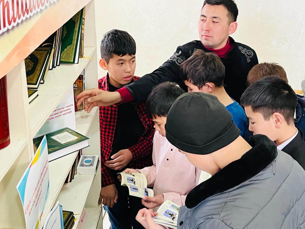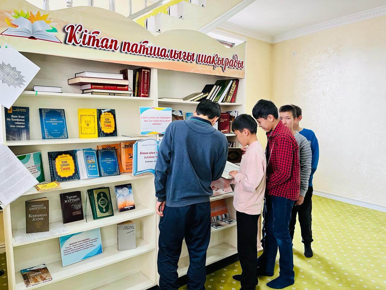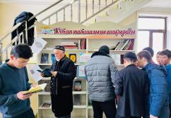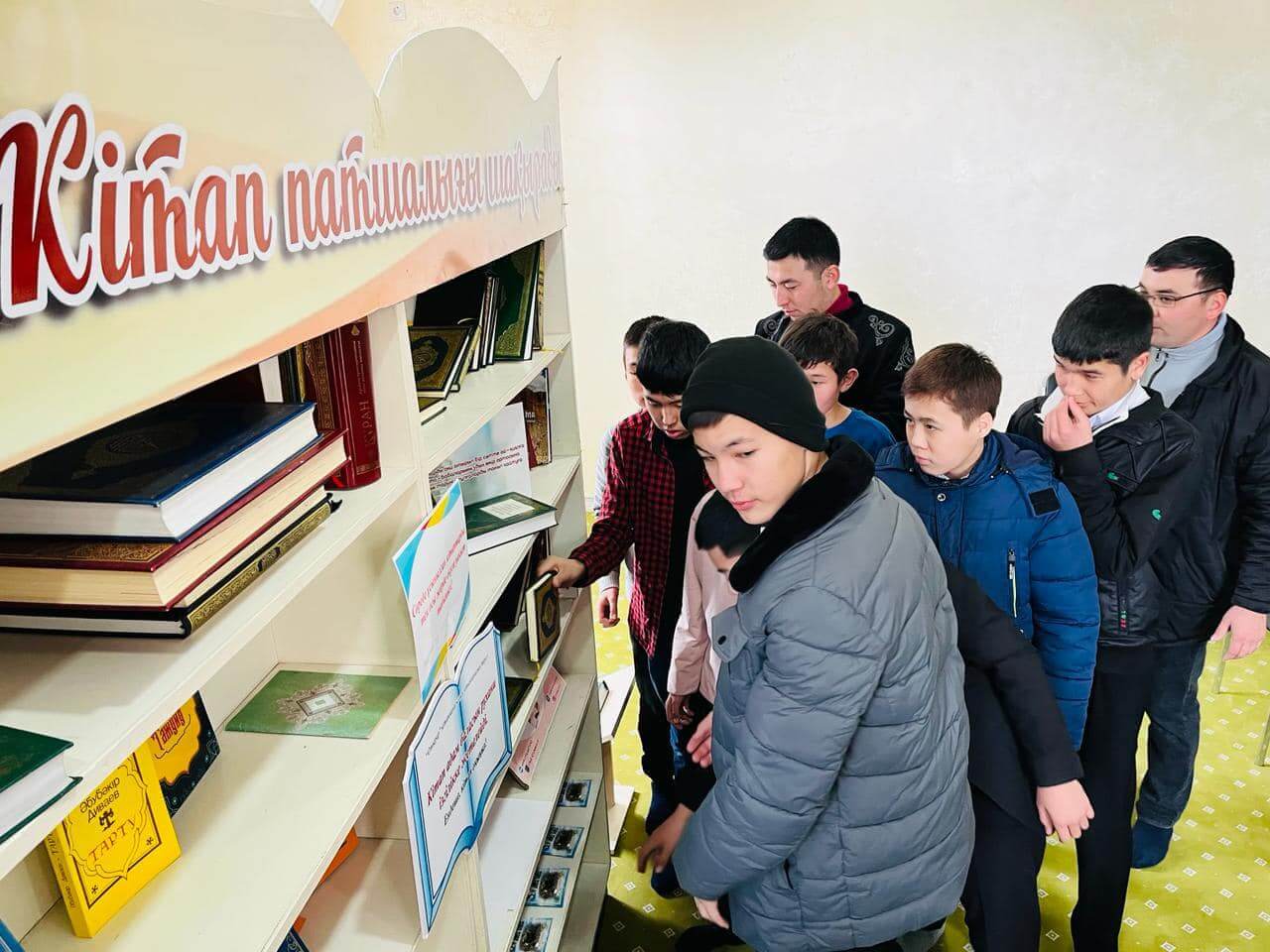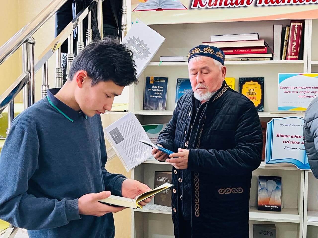 Аудан орталығындағы «Есен Ана» мешітіне жиналған көпшілік жылжымалы кітапхана нүктесіндегі жаңа кітаптармен танысуда