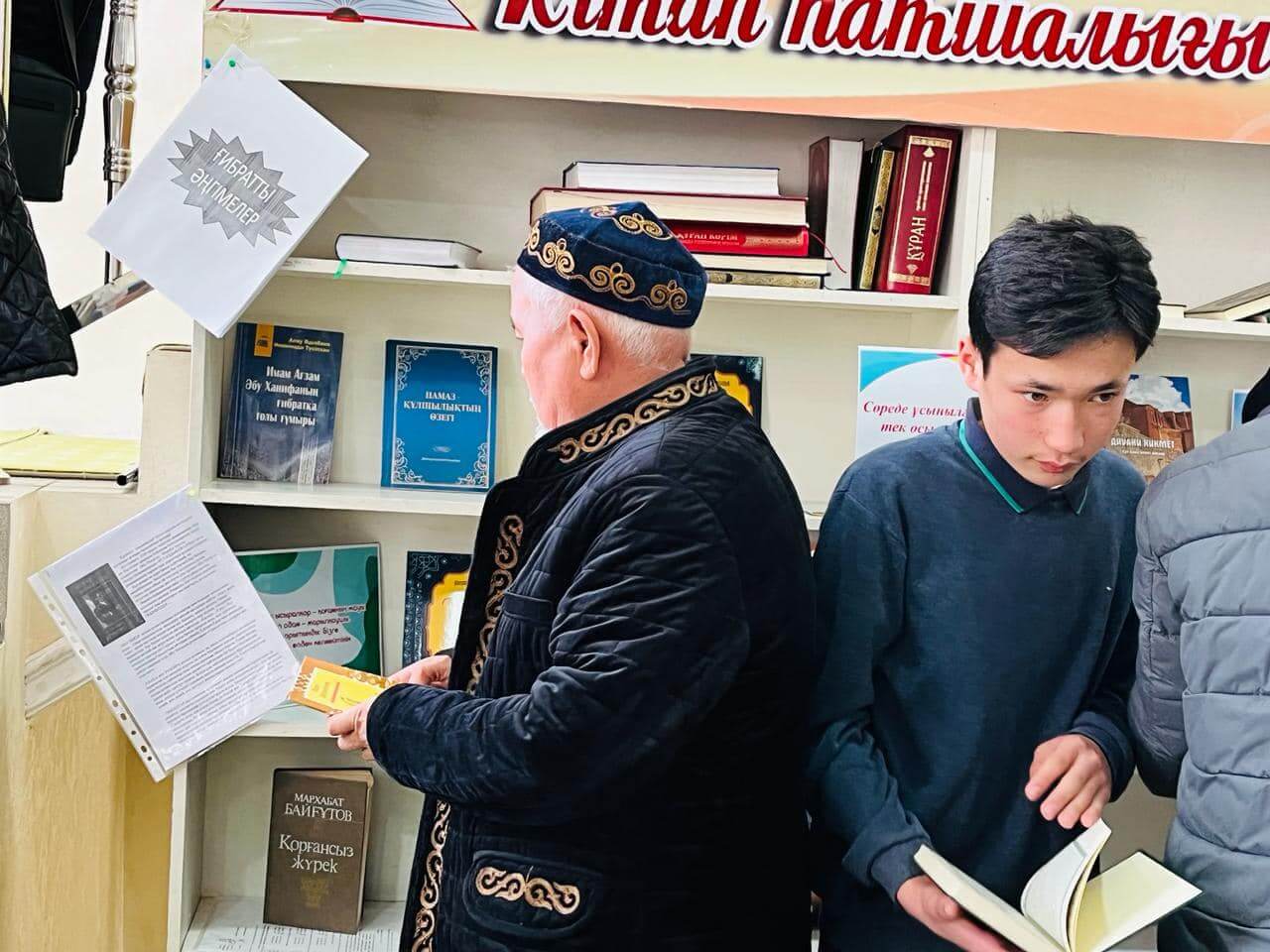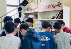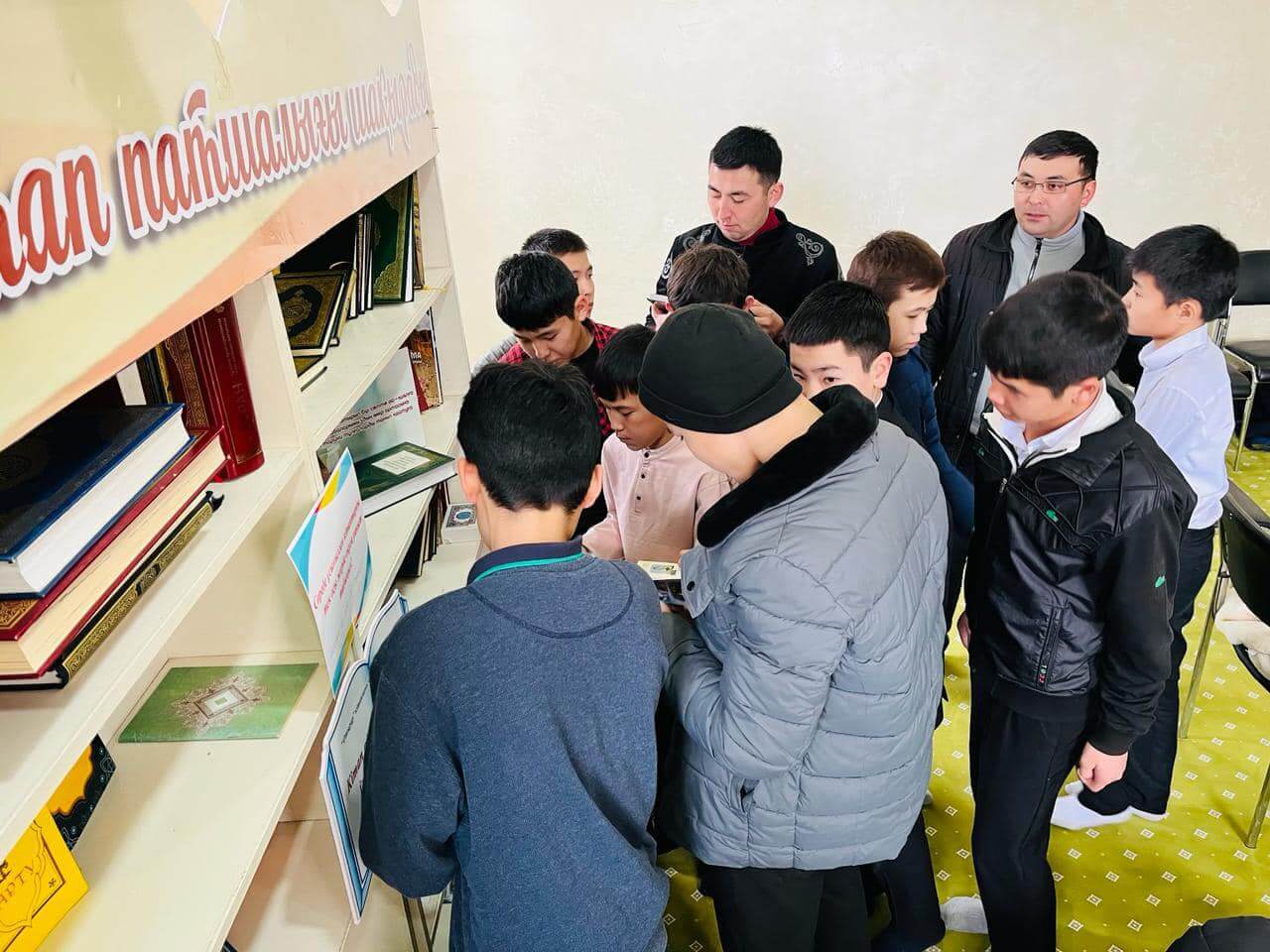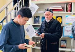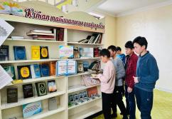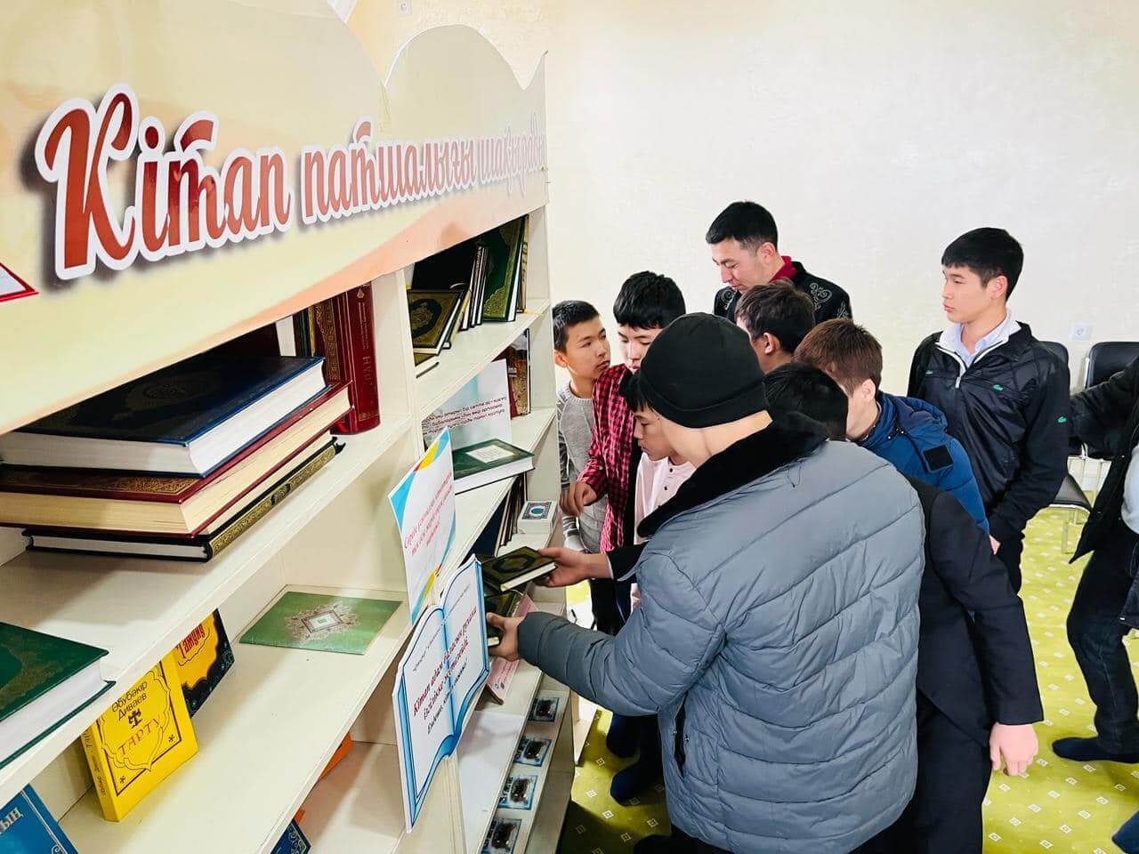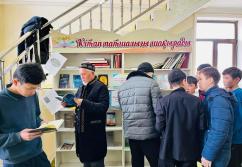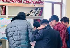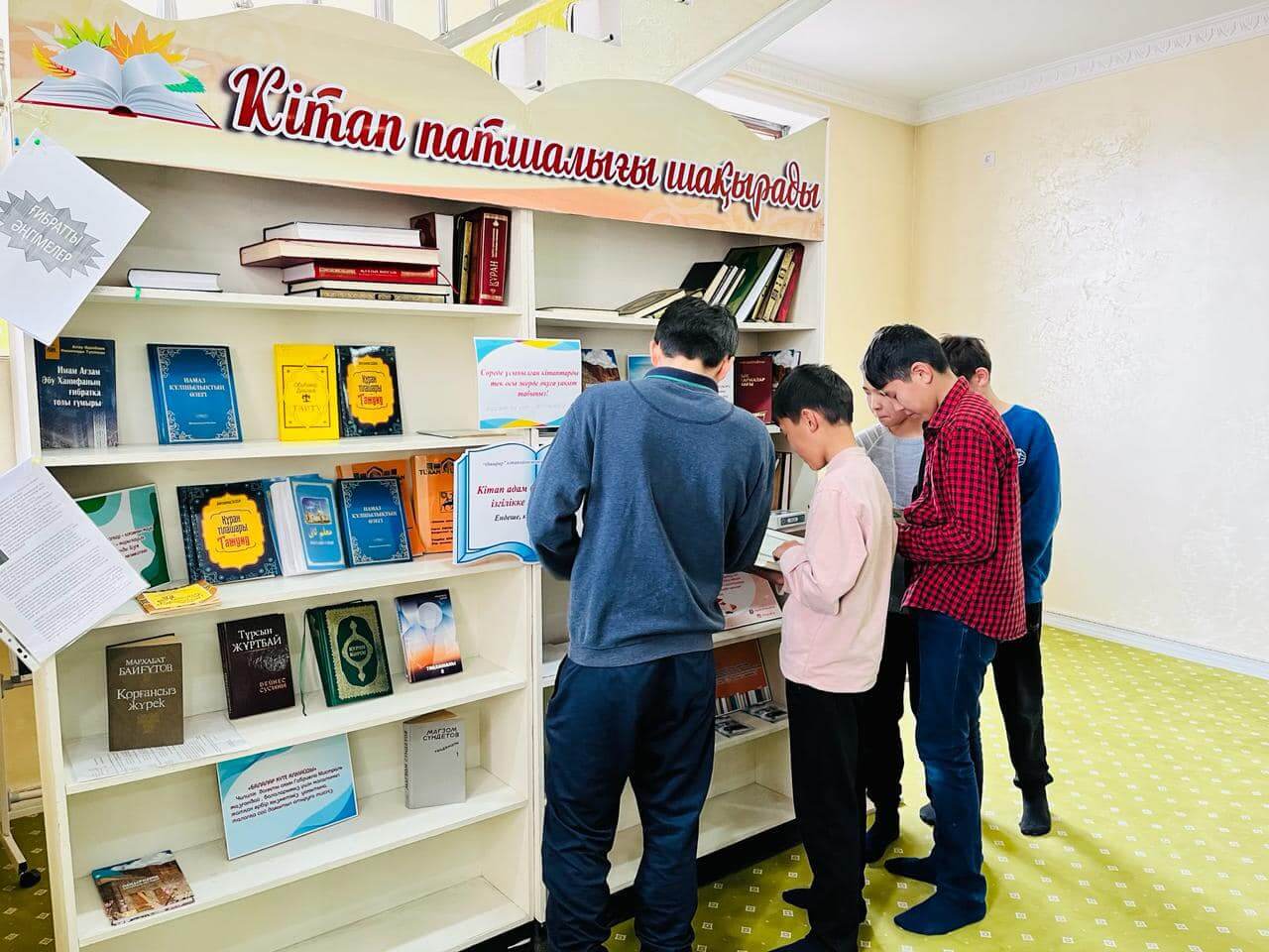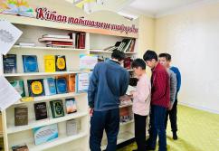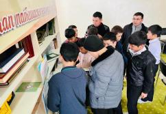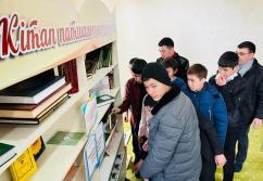 Аудан орталығындағы «Есен Ана» мешітіне жиналған көпшілік жылжымалы кітапхана нүктесіндегі жаңа кітаптармен танысуда