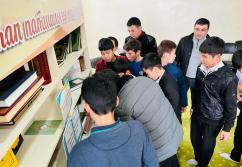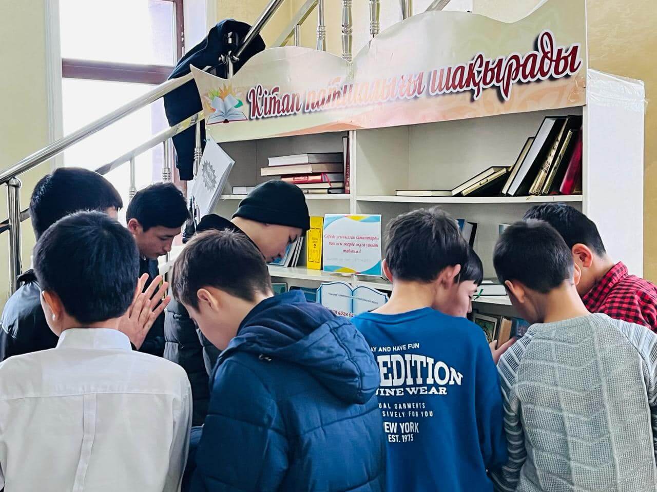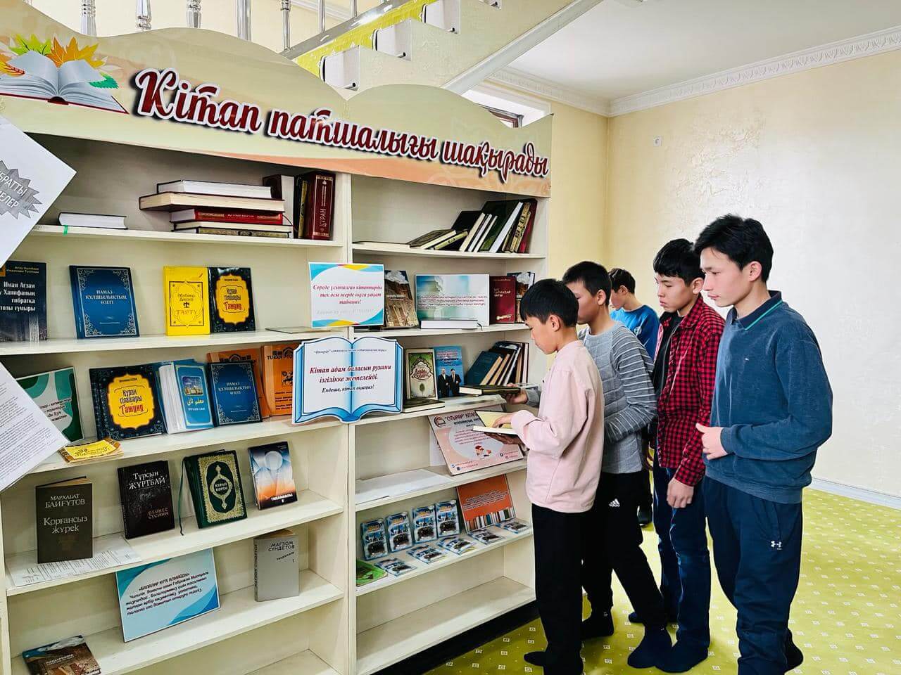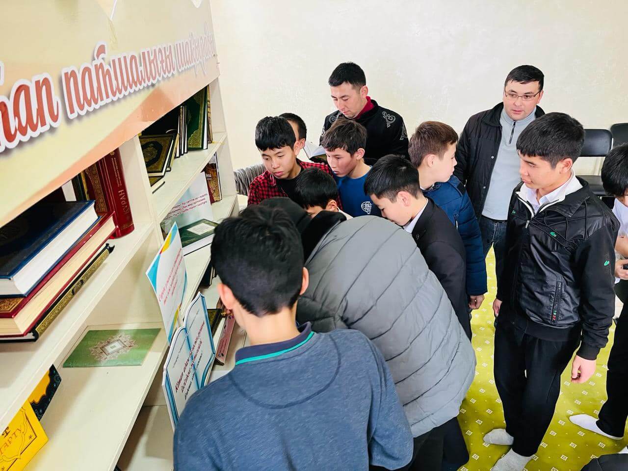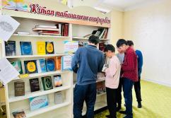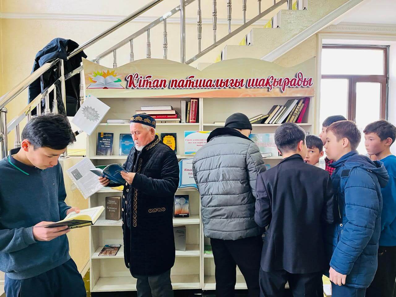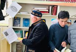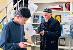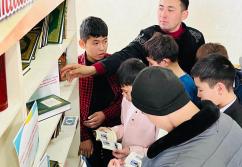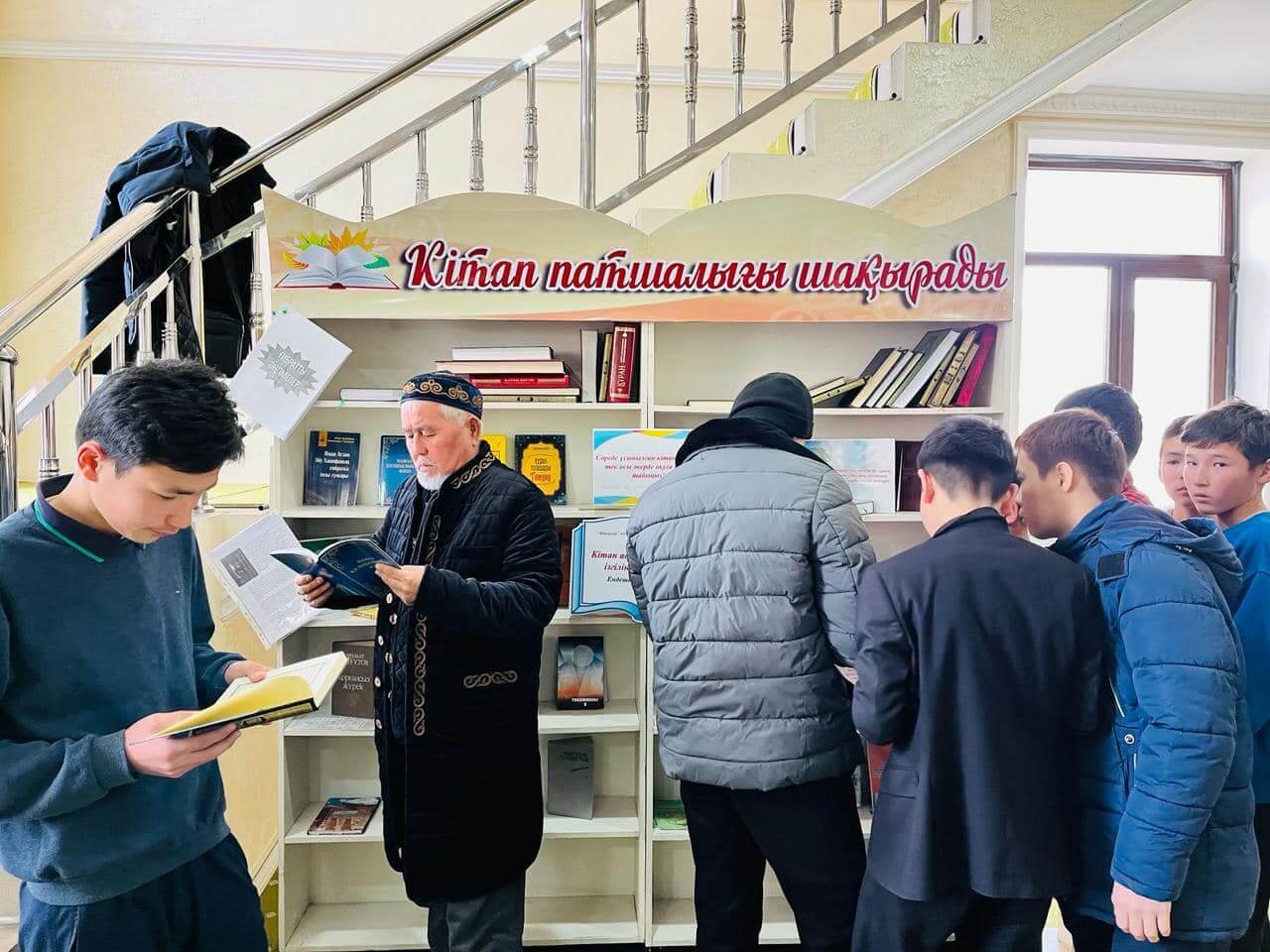 Аудан орталығындағы «Есен Ана» мешітіне жиналған көпшілік жылжымалы кітапхана нүктесіндегі жаңа кітаптармен танысуда