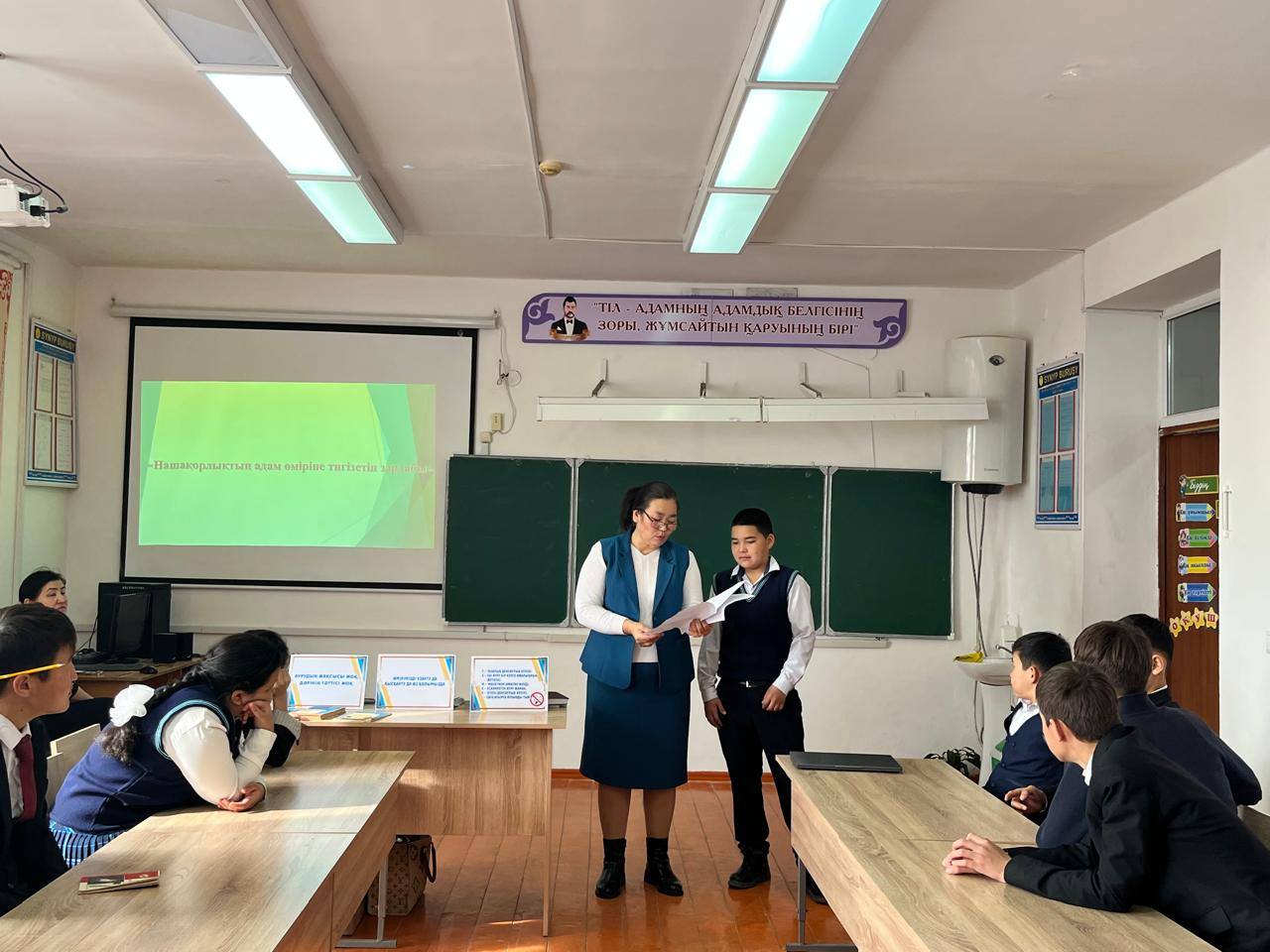 Іс-шара барысында кітапхана қызметкері С.Каленова мен мектеп психологы А. Пернебаева жас ұрпаққа есірткінің адам өміріне, денсаулығына, отбасына және қоғамға тигізетін зиянын түсіндіріп, болашағына балта шабатынын нақты деректер арқылы жеткізді.