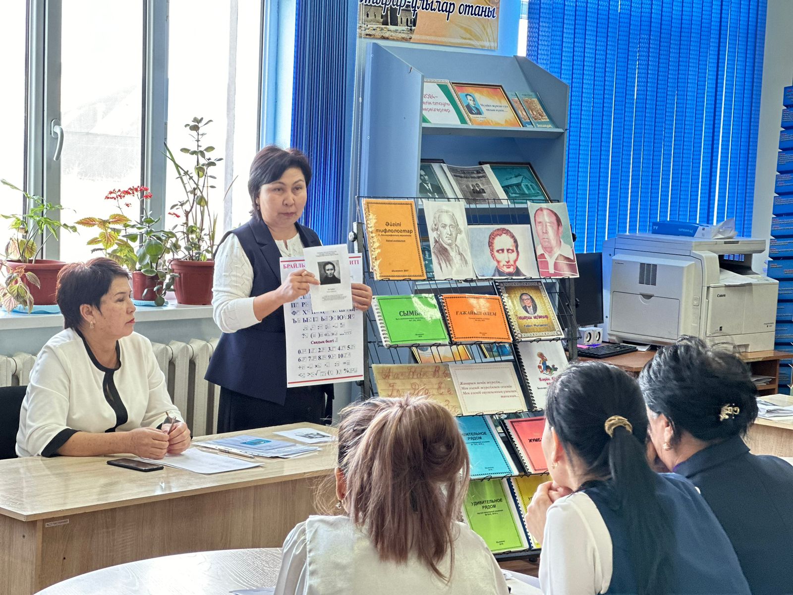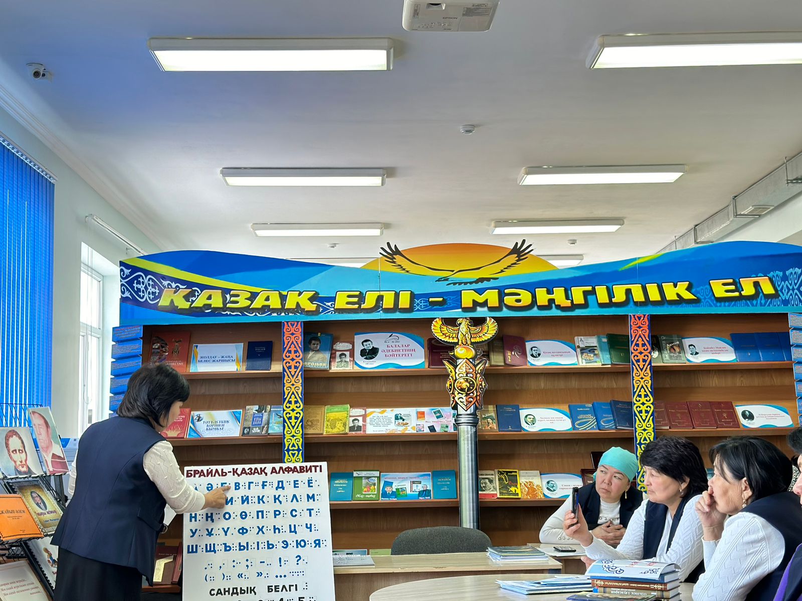 Бұл әліпби көзі көрмейтін адамдарға жазу мен оқуға мүмкіндік береді. Көру қабілеті нашар жандар үшін бұл қаріп тек байланыс құралы ғана емес, тілдік сауатты дамытудың бір жолы болып табылатынын және Брайль шрифтіндегі әріптерді тифлопедагогтың, кітапханашының көмегімен не өз бетімен де үйренуге болатыны жайлы кітапханашы Ф.Сихымбаева түсіндіріп, арнайы брайль қаріпімен жазып, оқу тәсілдерінің үлгісін көрсетті.