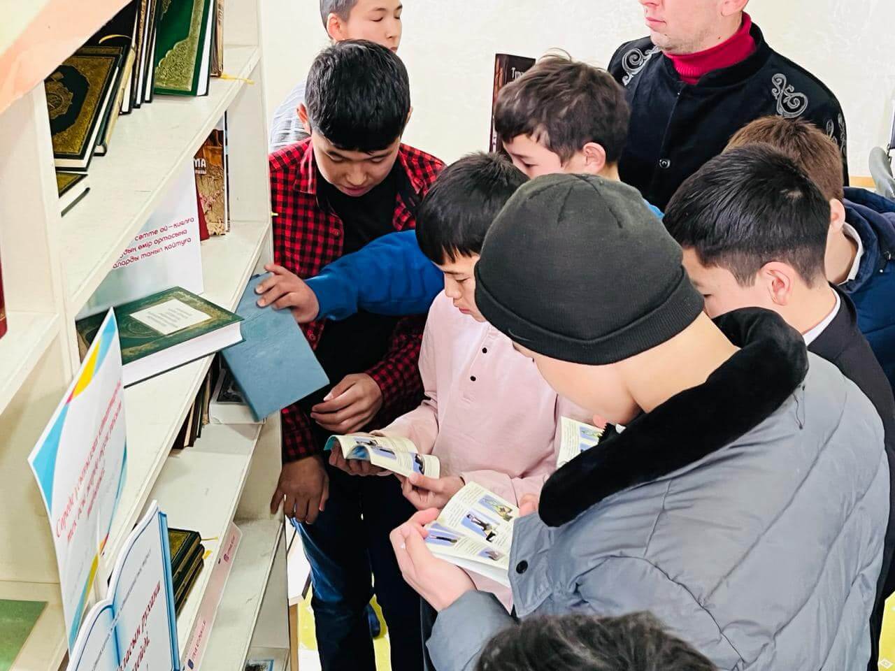 Аудан орталығындағы «Есен Ана» мешітіне жиналған көпшілік жылжымалы кітапхана нүктесіндегі жаңа кітаптармен танысуда