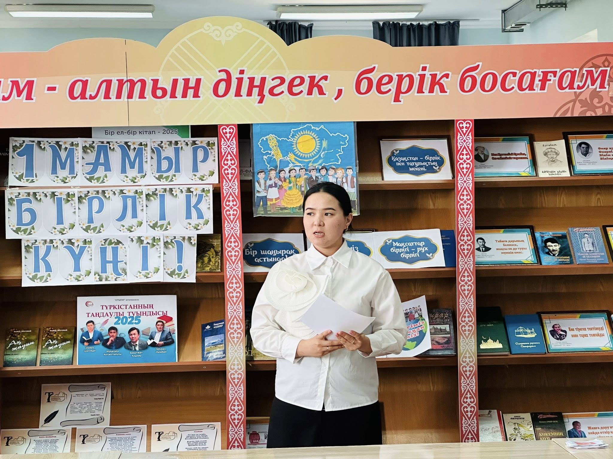 Бұл күн – әрбір қазақстандық үшін Отанға деген сүйіспеншілік пен патриоттық сезімнің, азаматтық борыш пен жалпы ұлттық келісімнің мерекесі. Мереке қарсаңында «Отырар» кітапханасында 1 – мамыр Қазақстан халықтар бірлігі күніне орай «Бірлік пен ынтымақ –басты құндылық» атты тақырыптық кеш өтті. Шара барысында сан ұлтты бір шаңырақ астына жинаған Қазақстан жайлы бейнеролик көрсетіліп, өлеңдер оқылды. Тақырыптық кеш соңында мекеме басшысы Пернебаева Роза Қазақстан халықтар бірлігі күнімен құттықтай келе «Еліміз аман, жұртымыз тыныш, ынтымағымыз берік болсын! Әрбір шаңырақтың берекесі арта берсін!» - деген тілегін білдірді.