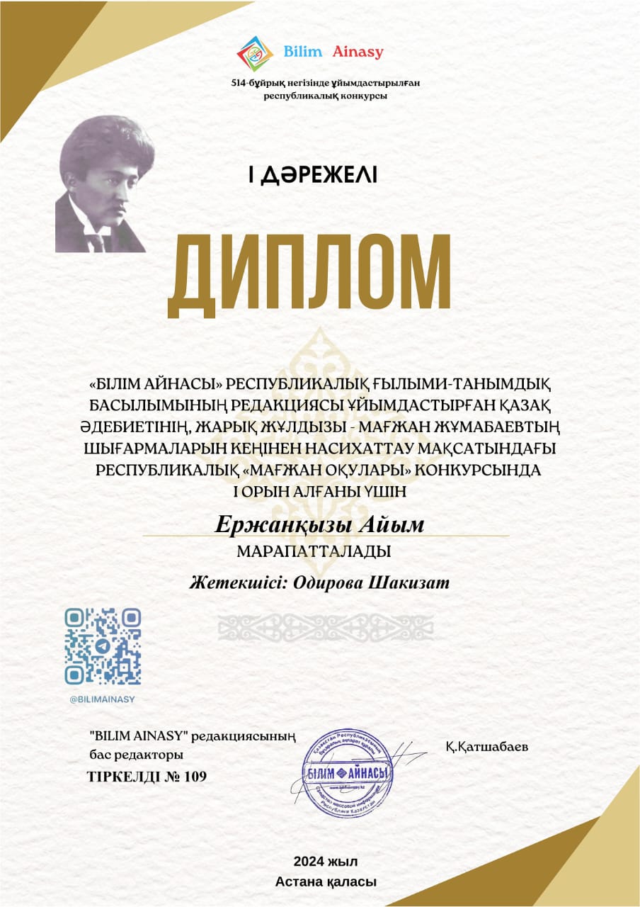 «Білім айнасы» республикалық ғылыми-танымдық басылымының редакциясы ұйымдастырған республикалық «Мағжан оқулары» конкурсында І орын алғаны үшін кітапханамыздың кішкентай оқырманы ержанқызы айым марапатталды. талабыңа нұр жаусын! биіктерден көріне бер, айым қыз!