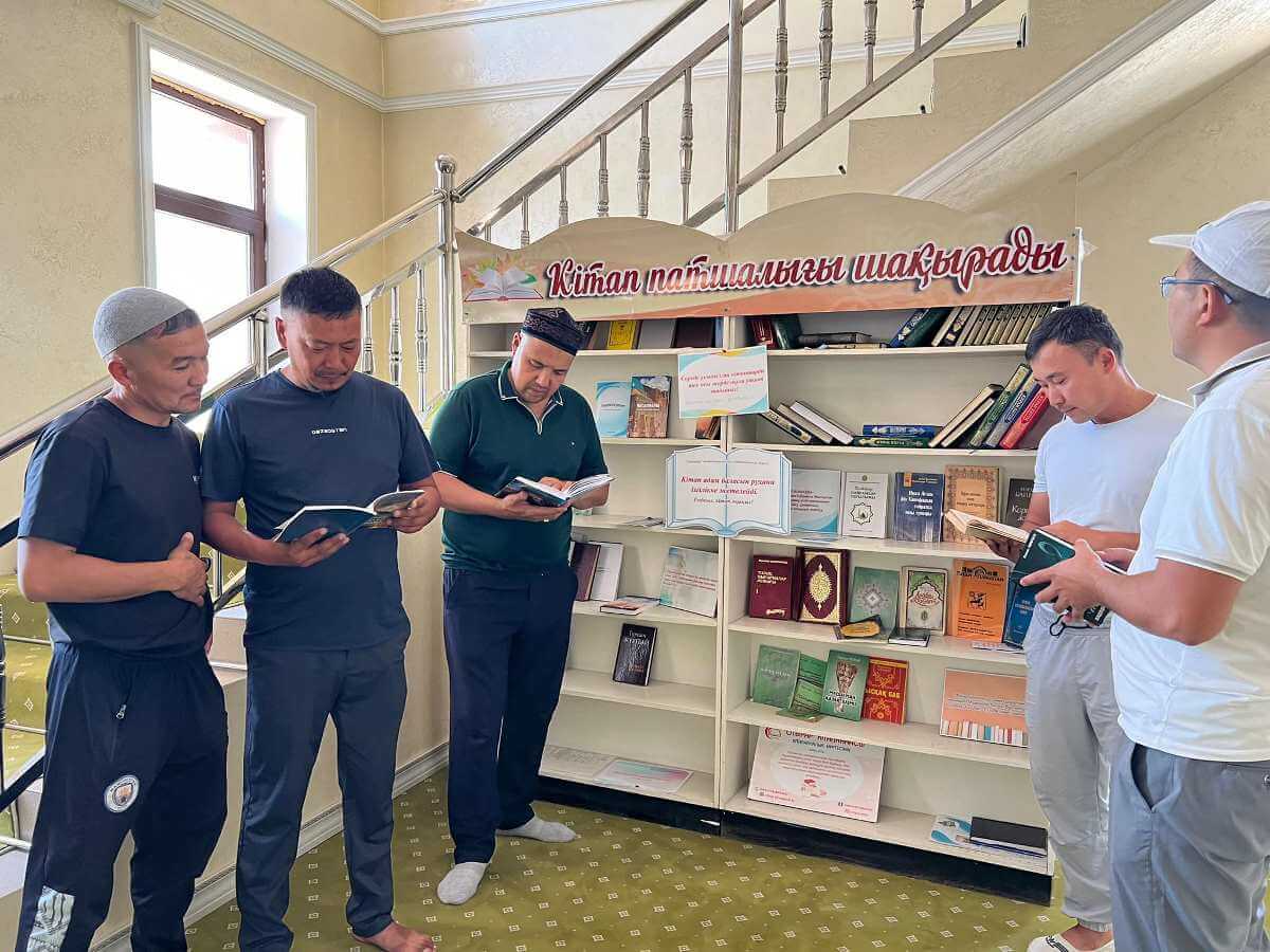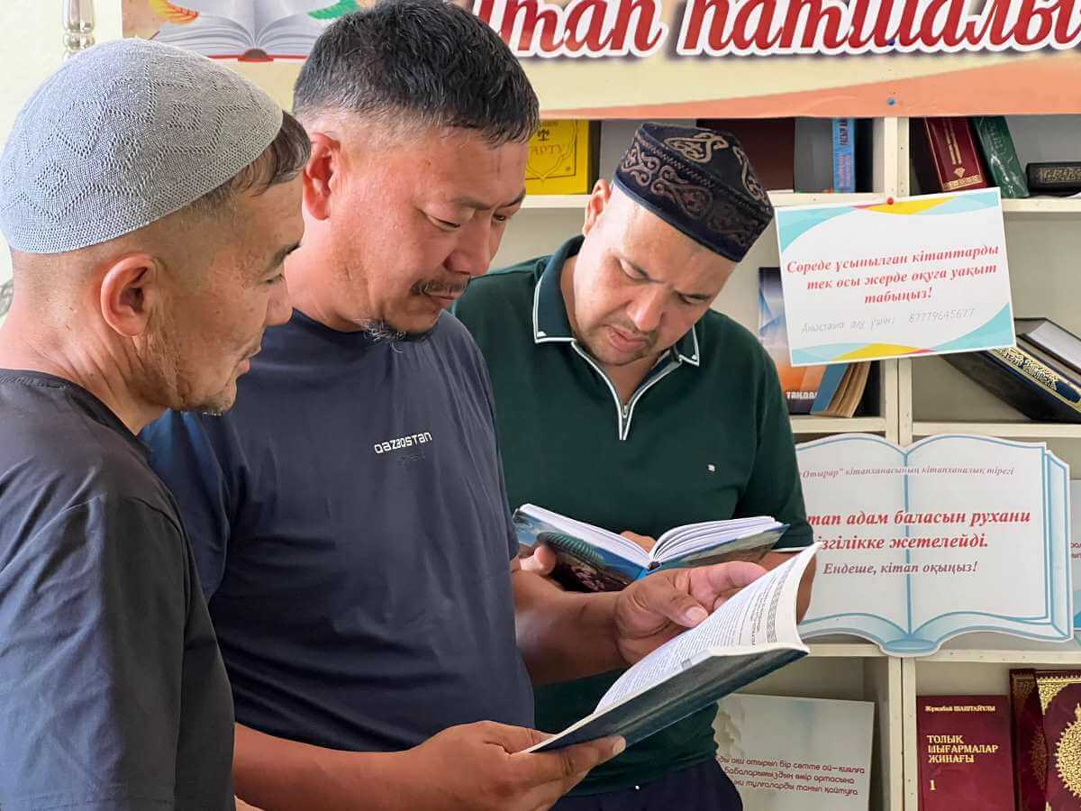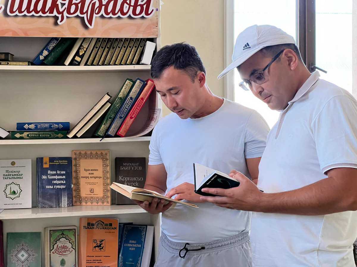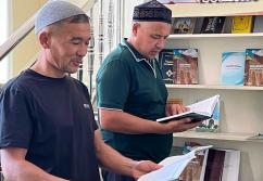 Шәуілдір ауылындағы "Есен Ана" мешітіне жұма намазына жиналған көпшілік кітапханалық нүктедегі әдебиеттермен танысуда