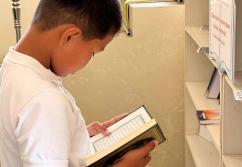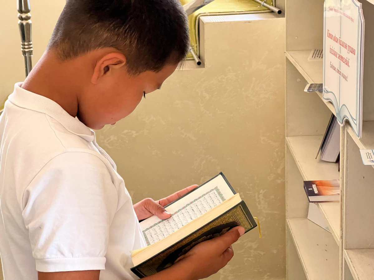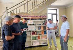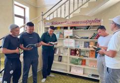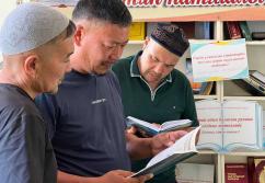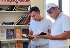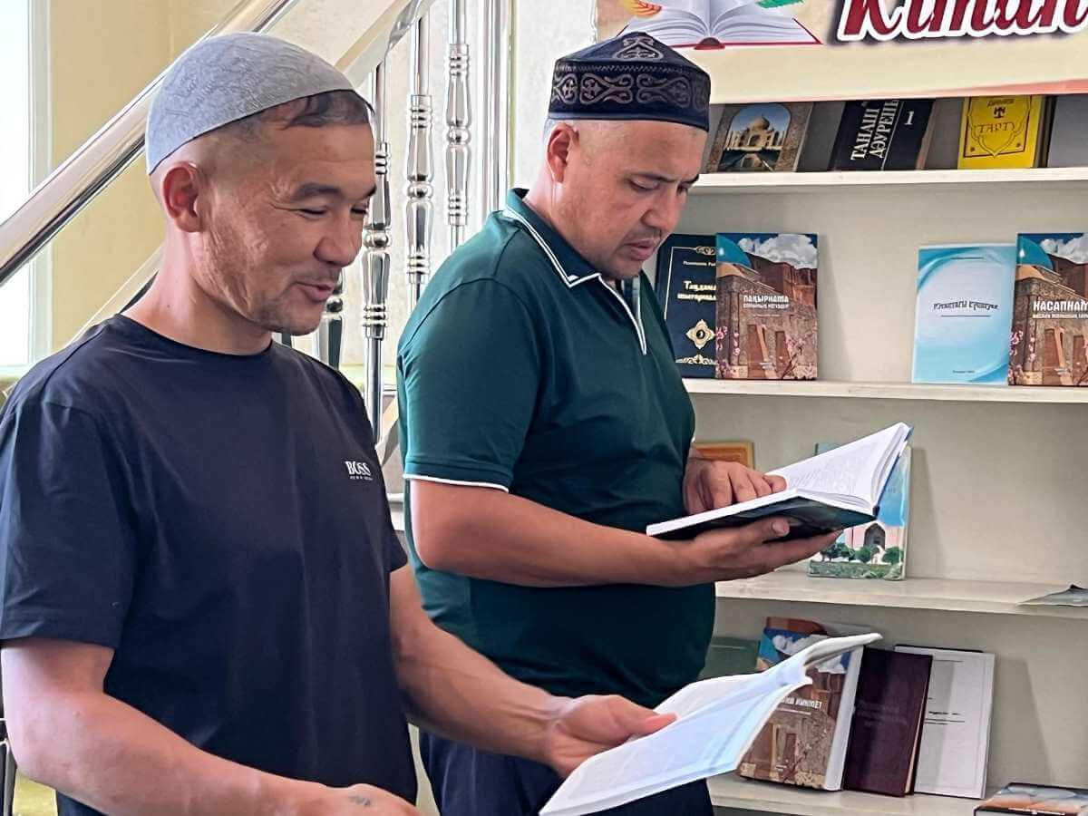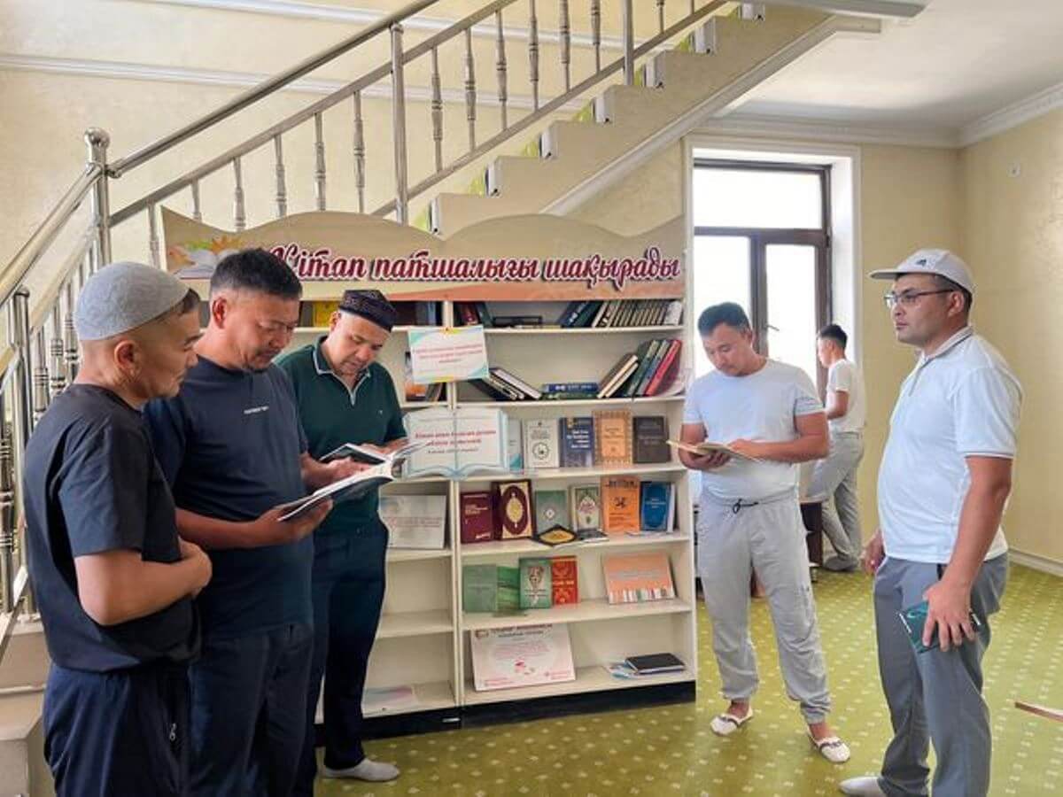 Шәуілдір ауылындағы "Есен Ана" мешітіне жұма намазына жиналған көпшілік кітапханалық нүктедегі әдебиеттермен танысуда